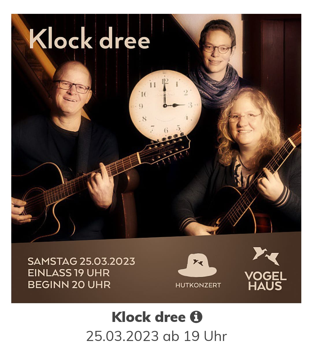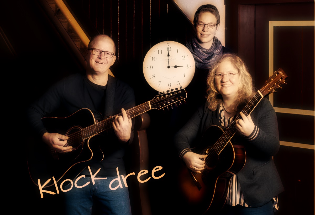 Unter dem Namen „Klock dree“ sind sie im Februar 2019 im Café Waldkristall erstmals gemeinsam aufgetreten. Bianca Oermann (Gitarre und Gesang) aus Hüllhorst, Imke Holtmann (Klavier, Gitarre und Gesang) aus Stift Quernheim und Elmar Schülingkamp (Gitarre und Gesang) aus Hille haben ihren gemeinsamen musikalischen Weg jedoch als „Die Drei ohne Namen“ ein Jahr zuvor mit zwei „Family and Friends“-Auftritten im Hüllhorster Reineburgkeller begonnen.